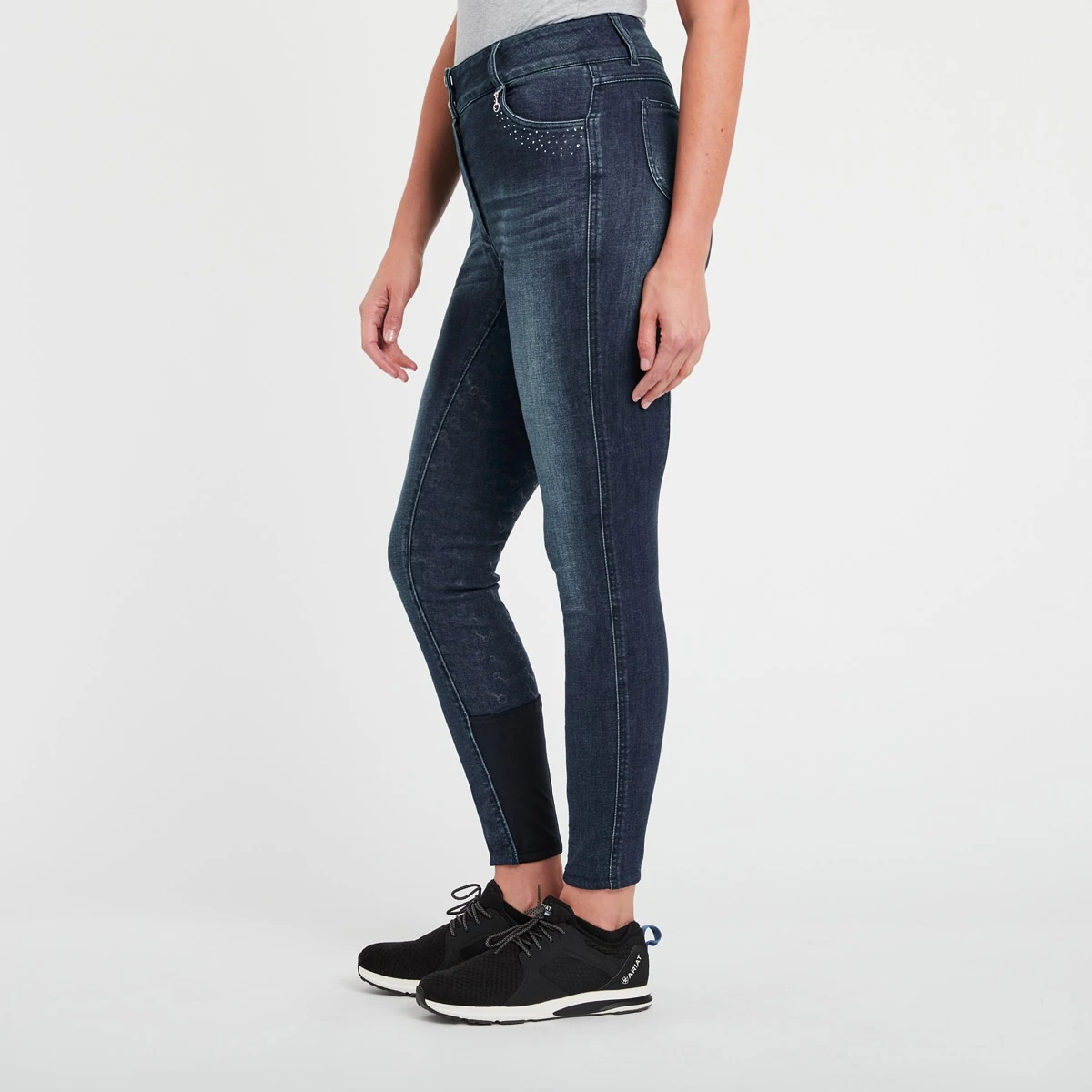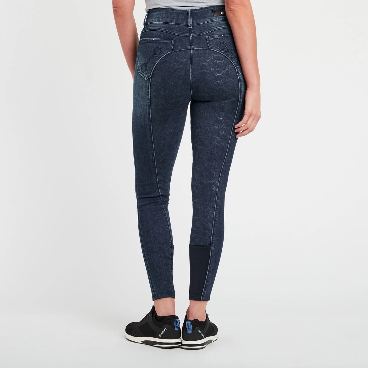 The Horze Kaia Women's High Waist Denim Full Seat Breeches with a silicone full seat print gives you confidence, support and grip in the saddle. The back pockets are embroidered wi…