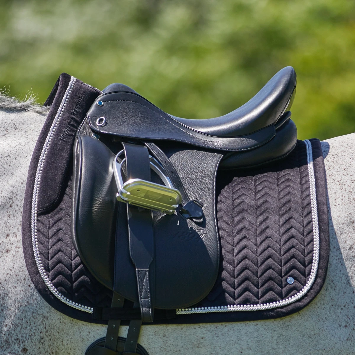 Have the best-dressed horse in the ring with the SmartPak Luxe Dressage Saddle Pad – Velvet & Pearls Collection. Elegant velvet with herringbone quilting is bordered by rope an…
